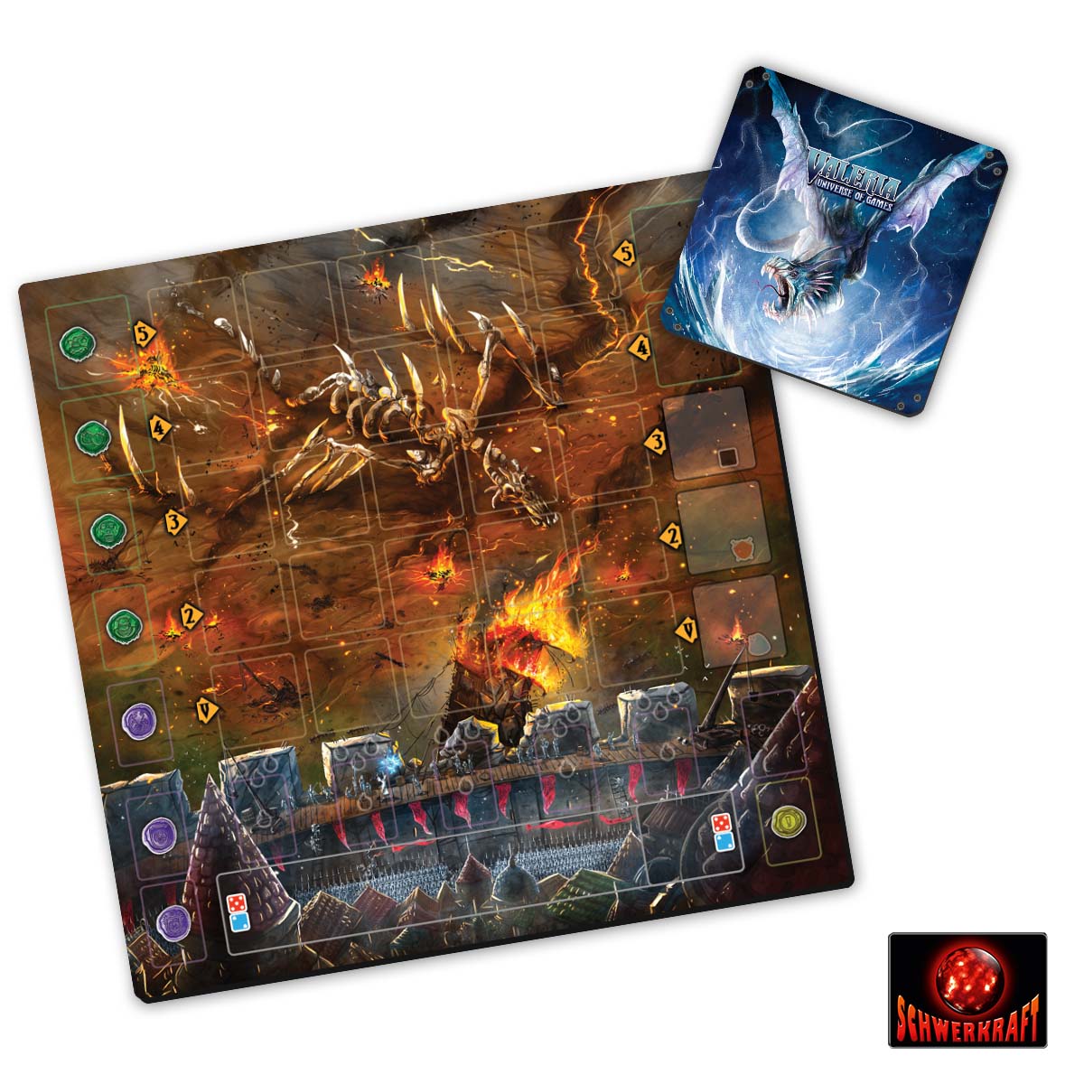 - Zu Valeria haben wir nun eine faltbare Valeria-Würfelschale im Sortiment, die natürlich für alle Spiele mit Würfeln genutzt werden kann. Für das geniale Solo-Spiel Belagerung von Valeria haben wir eine schöne Spielmatte, leider hat diese durch den Transport zu uns eine leichte Wellenbildung erlitten.
